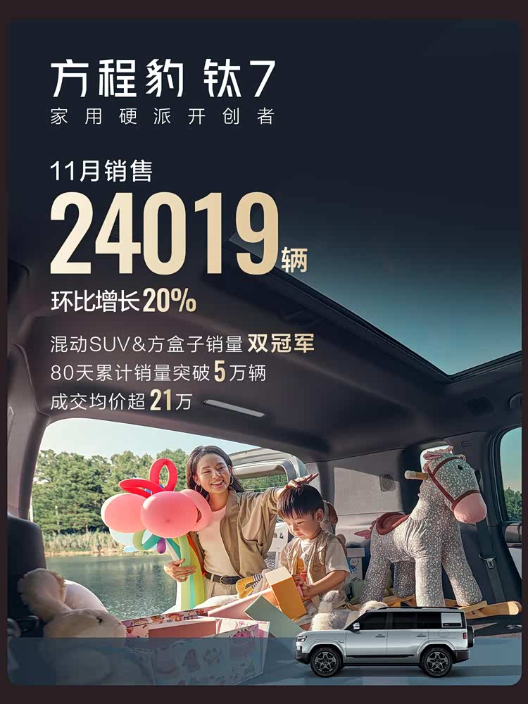 方程豹旗下“5837”四大车型——豹5、豹8、钛3、钛7,均是各自细分品类的开创者,在各领域成绩表现亮眼。尤其是钛7,11月销量再创新高,成功引爆SUV市场。