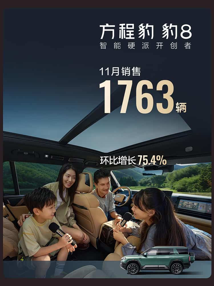 而豹系列的实力同样不容小觑,豹5作为“电驱越野开创者”,累计销量已突破10万台,长期稳居新能源硬派越野销量冠军宝座。11月销售5569台,环比增长58.7%,成绩稳健,是当之无愧的“越野新王”。由比亚迪、华为、大疆联袂打造的“稀缺旗舰”豹8,作为“智能硬派开创者”,11月销售1763台,累计销量28288台,持续领跑40万级高端SUV市场。