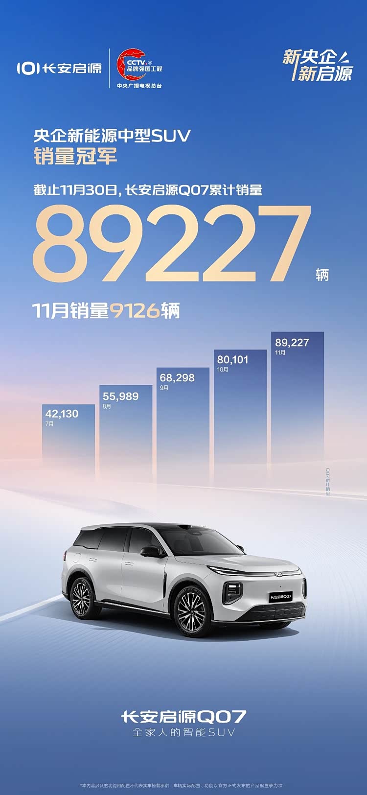 11月份刚结束,长安启源便交出了自己的成绩单:全系销量 46909辆,环比增长26%,同比增长31%,多点开花的产品布局展现出强劲的增长势能。其中,长安启源A06价格权益发布首月,订单突破 30000辆,热度席卷车市;长安启源全新Q05上市10天,订单突破 13000辆,登场即焦点; 长安启源Q07(参数|询价)也在11月份销量达 9126辆,累计销量达89227辆,进一步夯实其央企新能源中型SUV销量冠军宝座。长安启源多款车型齐头并进,共同构筑起长安启源的“爆款护城河”,“央企新能源,当然选启源”正成为越来越多的消费者的共识。
