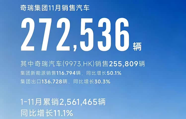 根据奇瑞集团公开的销售数据显示,在刚刚过去的11月份,奇瑞集团单月销量达到了272536台,其中,新能源汽车月销116794台,同比增长50.1%;海外出口136728台,同比增长30.3%。今年1-11月集团累计销量2561465台,其中,海外出口1199590台,新能源汽车814685台。