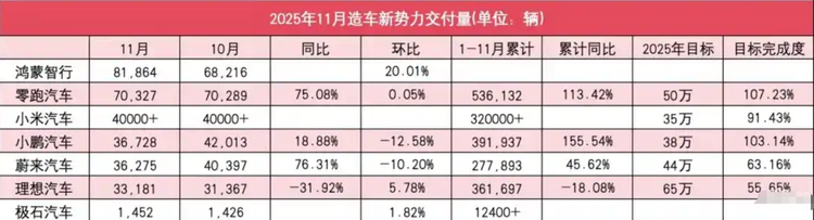 11月造车新势力的销量榜单上,前三名与后三位之间出现了一道清晰的断层。鸿蒙智行凭借五个品牌联合作战的策略,首次突破月销八万辆大关。这五个品牌覆盖从15万到百万级多个价格区间,从大众市场到超豪华市场全面开花。