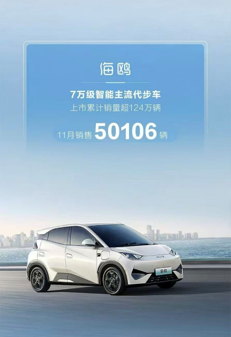 近日,比亚迪11月销量数据公布,海洋网单月销量达233431辆,延续一贯强势表现,旗下“百万销量俱乐部”明星车型、新一代主流代步车——比亚迪海鸥成绩尤为亮眼,11月热销50106辆,1-11月累计销量已达414102辆,上市累计销量已超124万辆,以高价值产品路线、迭代式全新体验,持续引领新能源汽车A00级市场向上发展。