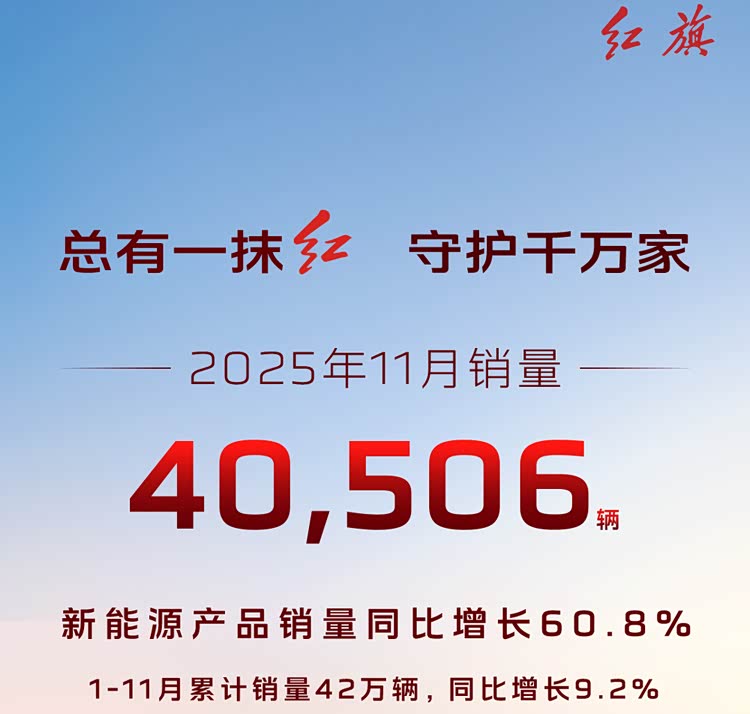 根据一汽红旗公开的销售数据显示,在刚刚过去的11月份,一汽红旗单月销量达到了40506台,其中,新能源产品销量同比增长60.8%。2025年1-11月累计销量42万台,同比增长9.2%。