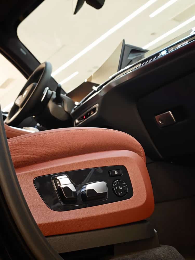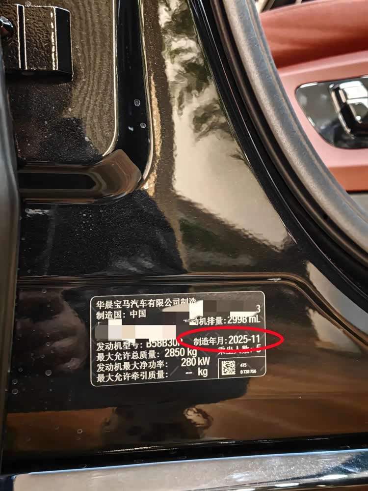 这台车B柱下方的铭牌写着制造年月是2025年11月,而且轮毂是21寸的744型,因此可以初步判定这是定价67.8万元的中配xDrive40Li M运动曜夜套装。实话说这款轮毂虽然不如最顶配的22寸那般运动,但也减少了一些破损的风险,21寸轮毂搭配蓝色卡钳效果看着挺可以了。