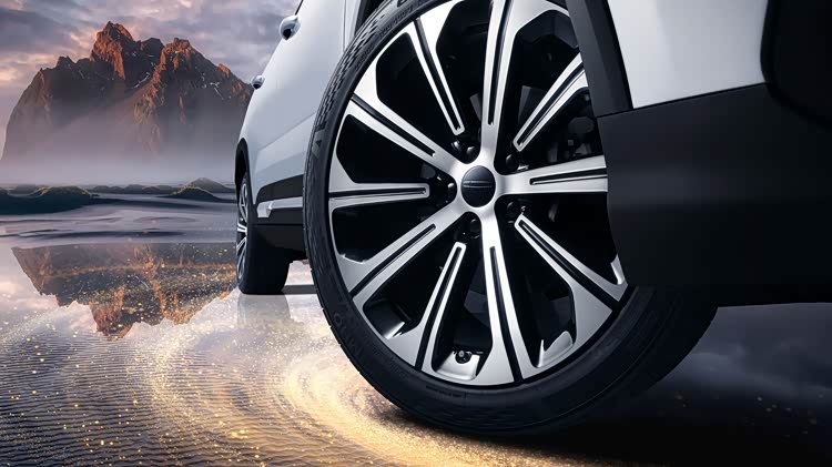 车侧与轮毂的设计进一步呼应了动态的自然韵律。20英寸多辐“聚势”轮毂,运用复杂的银黑撞色与型面切割工艺。静态时,其深邃的造型如同吸引目光的星际漩涡;当车轮滚动,辐条旋转化作流动的璀璨星河,营造出蓄势待发、生生不息的能量感。这种动静皆宜的美学表达,让豪越L无论驻停还是驰骋,都自成风景。