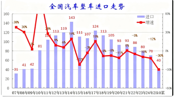 根据乘联分会数据,2025年前10个月,中国汽车进口市场延续了近年的下滑趋势,进口总量仅为40万辆,同比大幅下降30%。这一萎缩态势是自2014年进口车达到143万辆峰值后持续调整的结果。