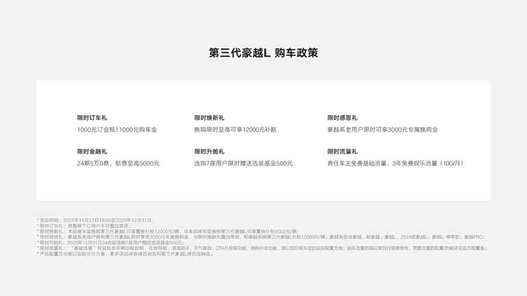 车家号·0浏览·2025-12-02 20:49 · 北京日前,吉利汽车宣布,新款第三代 豪越L(参数|询价)正式上市,售价9.99万元起。豪越L产品定位为燃油动力中型SUV,基于老款豪越L,新增5座版和1.5T发动机可供选择。