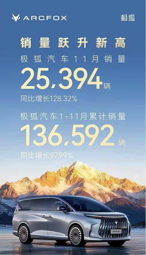 11月,极狐汽车再次交出了一份“2万+”的销量答卷:整月共售出25394台车,同比增长128.32%。