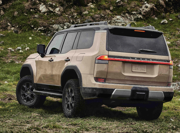 新款雷克萨斯GX提供8款外观颜色,车身依旧延续了有棱有角的方盒子轮廓设计,车顶加入了黑色全尺寸的行李架,与黑色的车窗饰条、黑色的全车隐私玻璃融为一体,整体感很强,也打造出了悬浮式车顶的立体视觉效果。车身加入了凌厉的腰线设计,黑色的轮眉与侧裙巧妙地结合在一起,营造出丰富的层次感。19英寸熏黑多辐式铝合金轮圈搭配着越野专用的AT胎,让它更加霸气威猛。车身尺寸方面,车辆长宽高分别为4960(4970)/1980(2000)/1925(1935)mm,轴距为2850mm。车内采用了5座、6座布局,配备了真皮拼接的沙发座椅,配备了21喇叭的Mark Levinson马克莱文森高级音响提供,提供给了更加宽敞舒适的乘坐空间。接近角26°,纵向通过角24°,离去角是22°,最小离地间隙达到了260mm(提升了2.54厘米),通过性也有了很大的提升。