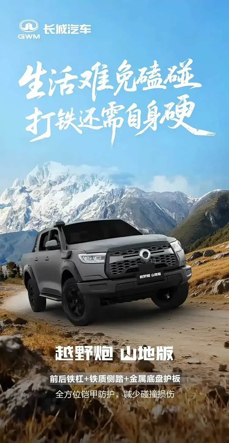 新款山地版沿用了长城越野炮的整体设计风格,但在细节上做出了越野化改进。车头依旧采用大尺寸黑色网格格栅,搭配粗壮前保险杠和黑色轮毂,提升了视觉厚重感。同时,新车在前后保险杠、侧踏板等部位使用铁质材质,并增加金属底盘护板,这些设计对越野通过性和低速防护有直接作用,尤其适用于复杂地形或非铺装路面驾驶。车身尺寸与标准车型一致,但强化部件使整体耐用性提升。