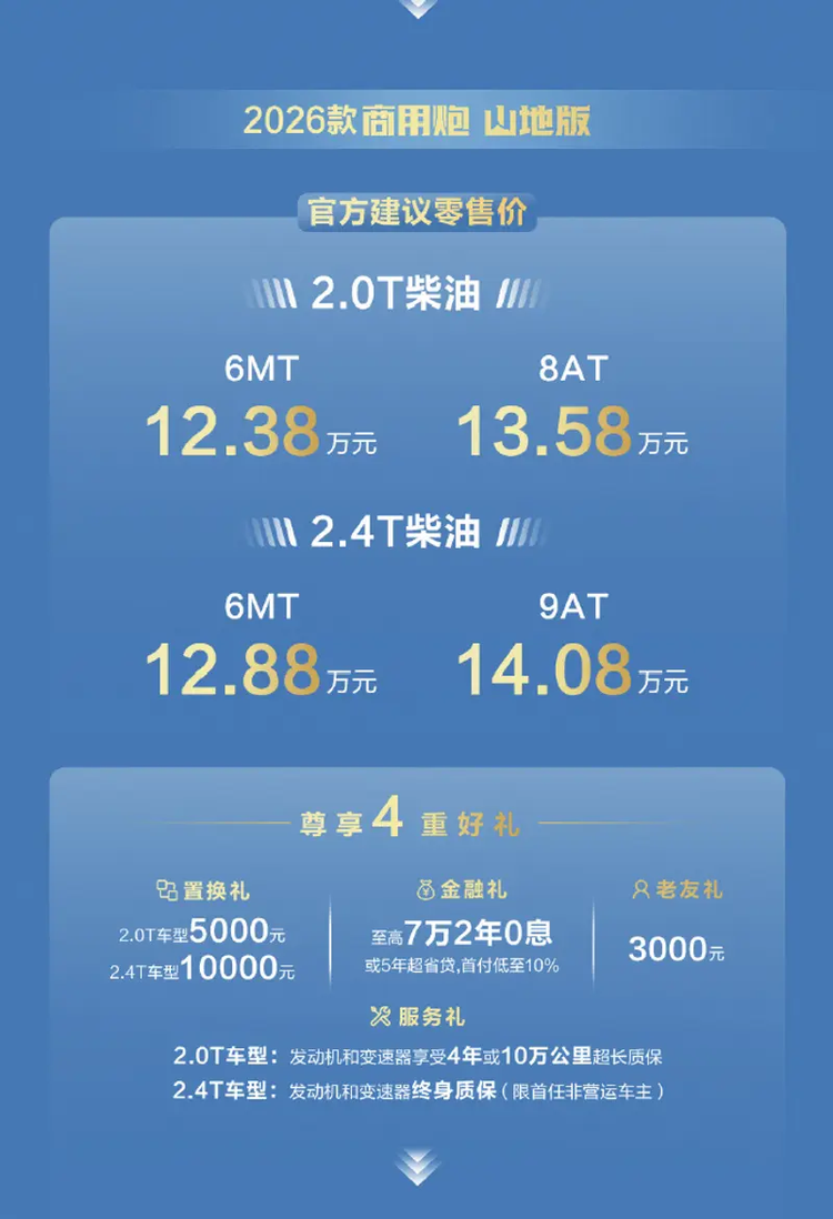 从配置和价格来看,长城炮山地版适合对越野性能有明确需求但预算有限的用户。入门价格12.38万元起提供基础越野强化配置,而高配车型在动力和智能辅助方面更为全面,可满足短途越野或多用途出行需求。动力、底盘保护和四驱系统的组合使车辆在山地及复杂路况下表现均衡,同时内饰布局和智能驾驶辅助功能保证日常使用的便利性。购车选择可根据主要用途确定动力类型:若偏向越野和负载,柴油版优势明显;若兼顾城市和高速行驶,汽油版性价比更合适。