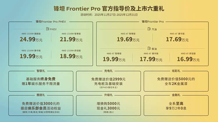 近日,郑州日产锋坦Frontier Pro进行了全球首发,其中锋坦Frontier Pro售价区间16.99万元-19.99万元, 锋坦Frontier Pro PHEV(参数|询价)售价区间18.99万元-24.99万元。据悉,锋坦Frontier Pro作为日产全球皮卡车型,这是首次在中国进行首发上市,充分证明日产品牌对于中国市场的重视程度。