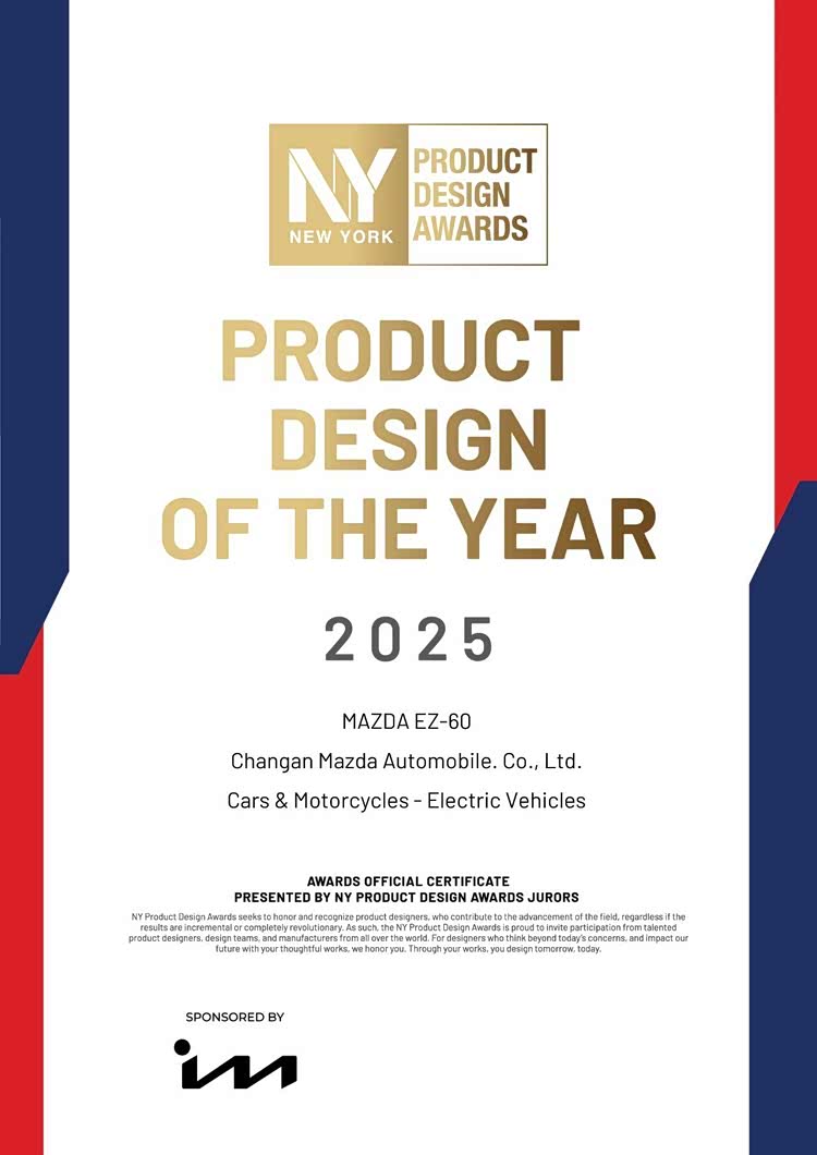 近日,九风道悦级智能SUV长安马自达MAZDA EZ-60(以下称EZ-60)再传捷报:凭借突破性的设计创新与实用美学融合,一举斩获2025年纽约产品设计奖(NY Product Design Awards)与Titan创新奖(Titan Innovation Awards)年度设计奖。此前,EZ-60已将2025缪斯设计奖·铂金奖与年度最佳设计大奖收入囊中,短短数月内包揽四项国际顶级设计荣誉,成为首个在全球四大设计赛事中实现“大满贯”的中国智造新能源SUV,以东方美学与工程智慧的完美融合,在全球设计舞台绽放璀璨光彩。