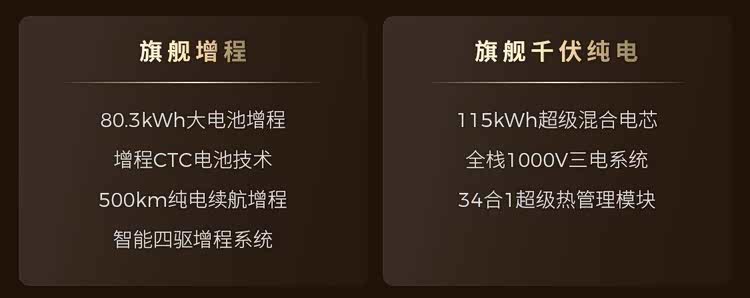 再看动力,黄金增程,1.5T增程发动机搭配后驱或者综合功率达449Ps的双电机四驱,它没有太超前的越野能力,但应付路况尚可的非铺装路面也是可以的。电池组容量为34.3kWh,不算大,CLTC纯电续航超200km,综合续航为1200km。