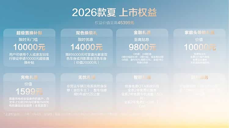 2025年11月4日,2026款夏正式上市,推出4款车型,限时超级置换价19.68—25.98万元,同时还在顶配车型基础上,准备了一个包含AR投影感应开启、副驾娱乐屏、智能香氛系统、迪声28扬音响系统等豪华配置的舒享选装包!此外,2026款夏在车色上做足了功夫,带来了两款价值两万元的定制双色车身,限时价格只要6000元。实实在在的中级SUV的价格,享有超越30万级的豪华配置。