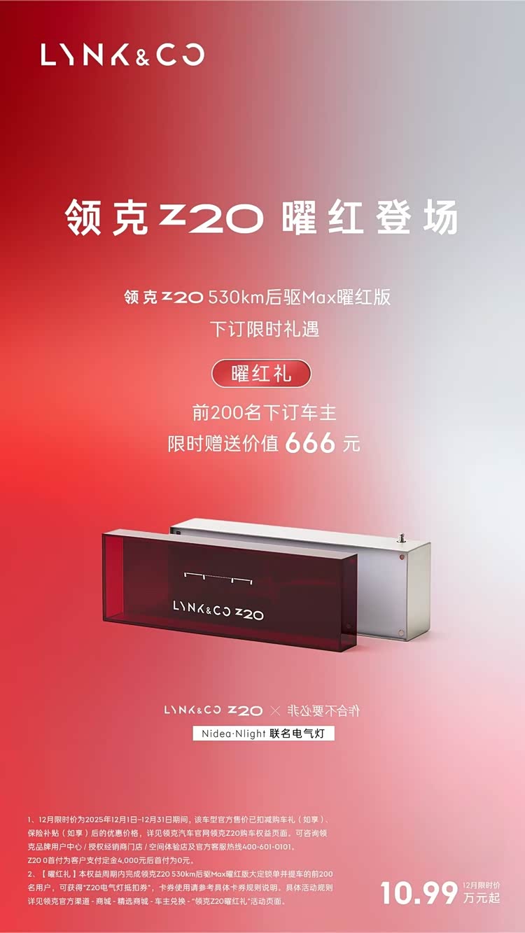 先从购车福利看起。根据领克官方政策,在12月下订领克Z20,可享3000元购车礼,3000元保险补贴,价值至高5500元焕新礼,至高10000元限时选装基金,2年8万0息或5年0首付的金融礼等多重福利,限时价仅10.99万起。另外,下订530km后驱Max曜红版的前200名车主,还限时赠送价值666元“领克LYNK&CO Z20x非必要不合作Nidea·Nlight联名电气灯”,线下试驾并完成评价则可获得试驾礼品。在福利这块,领克Z20直接是一步给到位。