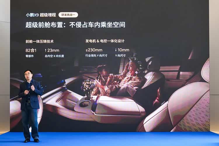 研发团队采用发电机与电控一体化设计,将发电机Y向尺寸控制在230毫米以内,较常规设计缩减10毫米;同时结合小鹏的前舱一体压铸技术,实现零部件82合1的集成度,使前舱总内空X向长度提升23毫米。通过这两项技术的结合,小鹏X9超级增程在实现『一车双能』(可油可电)架构的同时,保障了座舱的乘坐空间。