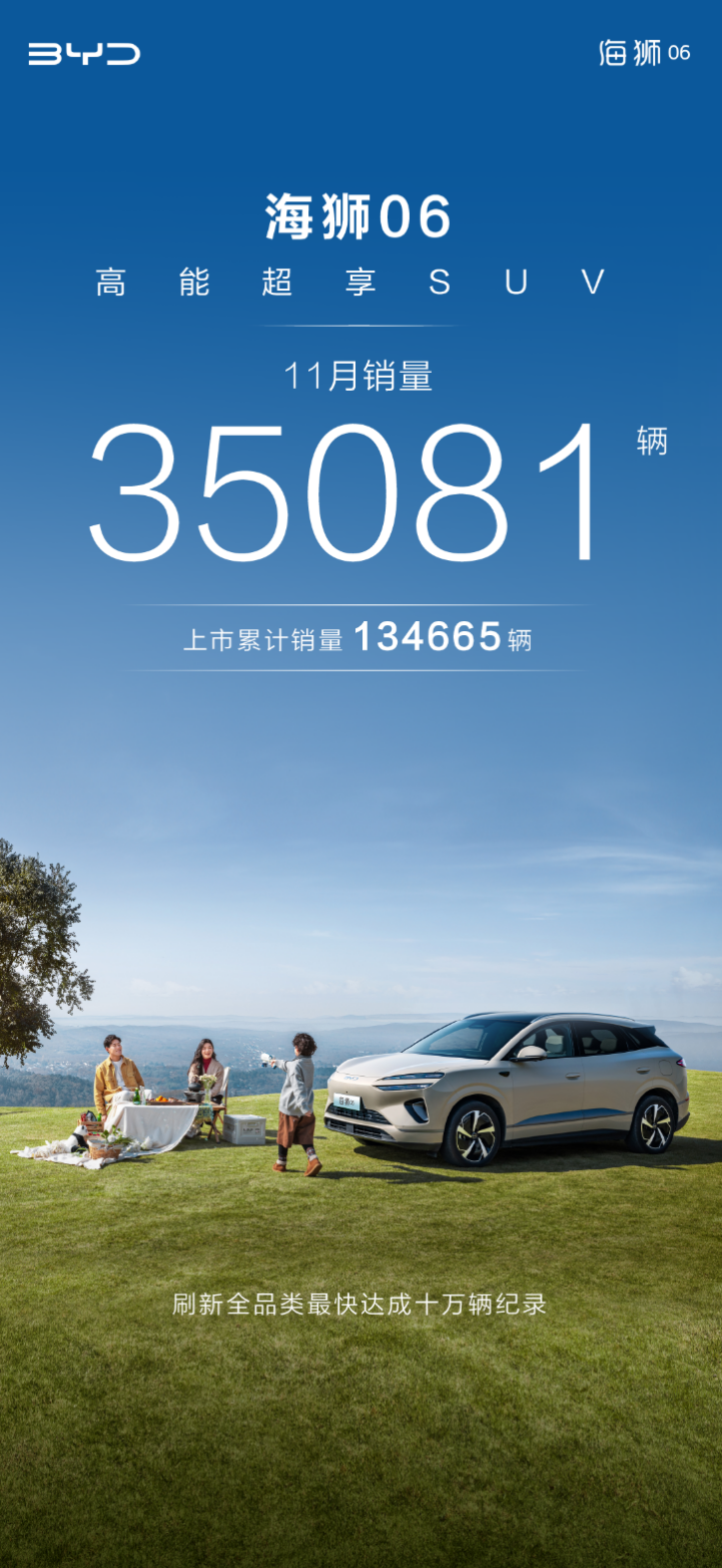 近日,比亚迪公布11月销量数据,旗下海洋网以单月热销233431辆的出色表现,展示出强大的市场号召力,成为集团销量担当。作为海洋网的核心战略车型,高能超享SUV比亚迪海狮06再次交出亮眼的成绩单:十一月热销量35081辆,这是继8月30483辆、9月30901辆、10月33200辆之后,连续第四个月销量突破三万大关。截至目前,海狮06累计销量已经达到134665辆。自7月底上市以来,海狮06不仅持续每周蝉联A级SUV终端销量冠军,更以爆款实力书写了“百日十万辆”的销量传奇,成为全品类车型最快突破十万辆的现象级产品。