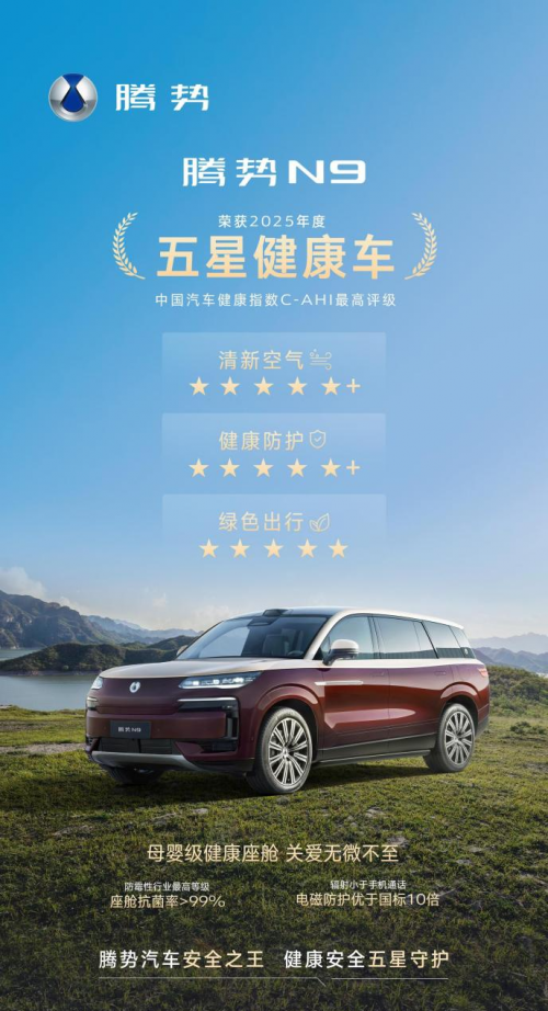 越来越多高知家庭、品质家庭选择腾势N9,不靠流量,而靠长期真实口碑持续发酵。五星健康认证,是腾势N9迈向更高健康安全标准的里程碑。未来,腾势汽车将继续推动中国新能源高端品牌不断向上,为用户带来更安全的旗舰出行体验。
