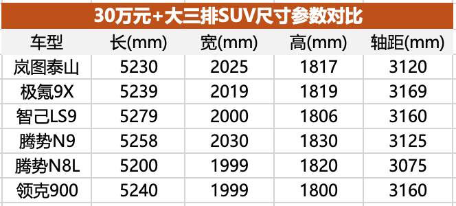 具体看参数的话,极氪9X、智己LS9、领克900的轴距最长,均达到了3.16米以上,岚图泰山、腾势N9则超过了3.12米,和前面3款车型有40mm左右的差距。