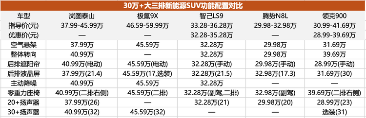 而在家庭用户比较关注的顶置娱乐屏方面,岚图泰山、极氪9X、智己LS9均是标配,其中智己LS9和泰山均是21英寸的中等规格,极氪9X和腾势N8L是17英寸的小屏,后者需要32.98万的顶配开始配备。