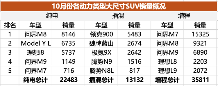 如上表,尺寸限定在C级中大型以上的新能源SUV,销量规模最高的增程类别,10月份总计大约3.6万辆,纯电和插混分别为2.25和1.31万辆,加起来勉强跟增程打平。
