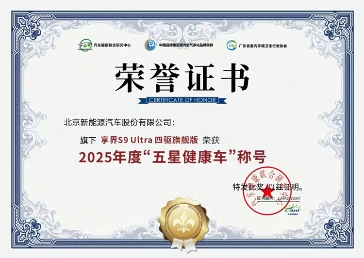 在消费者对健康出行需求日益提升的今天,汽车不再只是交通工具,更成为家庭健康的“第二空间”。11月28日,在2025中国汽车环境与健康高质量发展论坛上, 享界S9(参数|询价)凭借在清新空气、健康防护与绿色出行三大维度的卓越表现,荣获中国汽车健康指数(C-AHI)“五星健康车”权威认证,其中车内清新空气得分高达97.9分,斩获行业最高等级“五星+”殊荣。