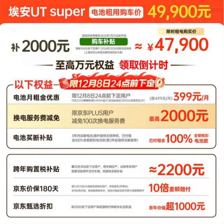 埃安UT super的电池租赁模式,本质上是一种“车电分离”的购车方案。消费者只需支付4.99万元购买车身,电池则以租赁方式使用。