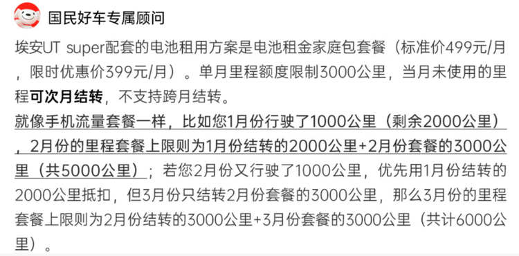 埃安UT super租电方案设置了每月3000公里的基础里程,超出部分按0.2元/公里收费。