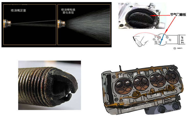 - 产生积碳影响喷油嘴、火花塞、节气门、氧传感器、压缩比