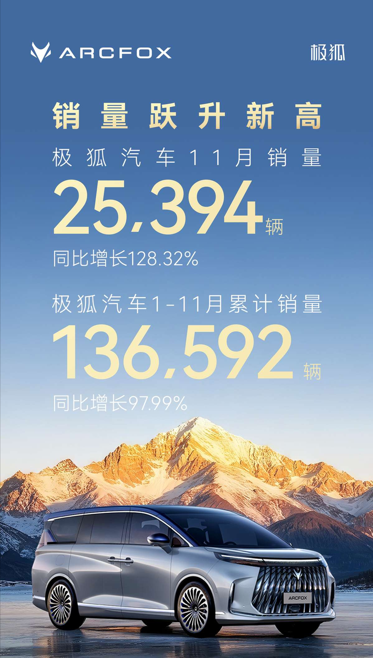 11月,极狐汽车再次交出了一份“2万+”的销量答卷:整月共售出25394台车,同比增长128.32%。