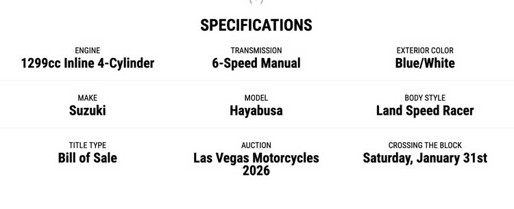 这辆 2000 年 铃木隼 不仅是辆赛车,也是个机车速度史上的一个里程碑。 由已故传奇车手 Bill Warner 亲手打造与驾驶,名为 “ Wild Brothers Racing (超狂兄弟赛车) ” 的 隼 于 2011年在美国Loring空军基地旧址,创下了令人咂舌的 502 km/h 世界纪录。 虽然 Warner 在 2013 年为了挑战更高极限而意外身亡,但他与这辆车所展现出的无畏勇气,已成为二轮竞速界的传奇。