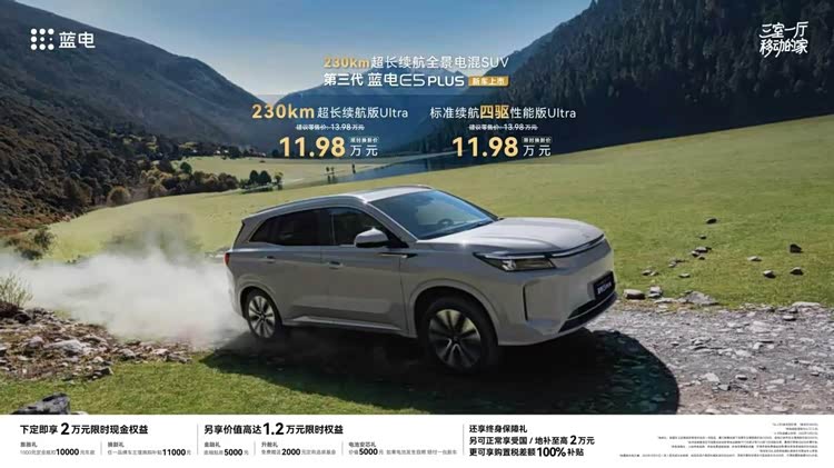 第三代蓝电E5 PLUS集超长续航、全时四驱、场景生态与智能座舱融于一体,构筑起全能越级的产品力与鲜明的差异化优势,成为12万级插混SUV的价值标杆。目前新车已全面到店,诚邀广大消费者莅临蓝电用户中心试驾体验。