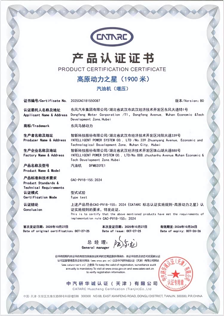 东风马赫B20TDE纵置混动专用发动机获“高原动力之星”认证