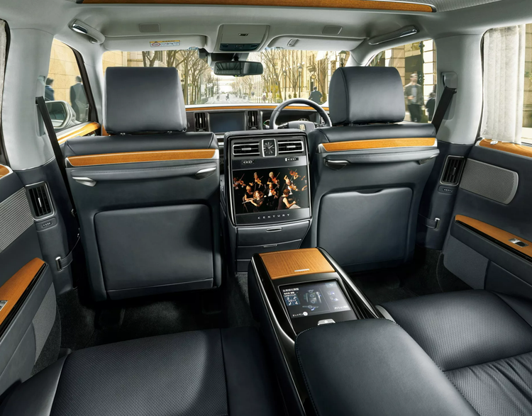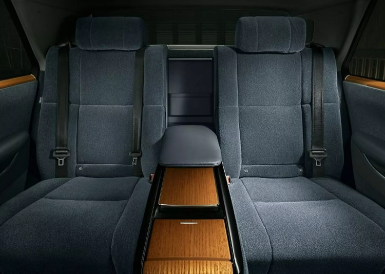 丰田世纪的后排同样采用了大量木纹饰板进行点缀,比较独特的是,这车后排中间的空调出风口并没有设计在中间地台处,而是把它设计得与前排座椅肩膀位置齐平,出风口中间设计了一块时钟,下方则是一块大屏幕,后排座椅中央扶手区域还有一块触控屏。
