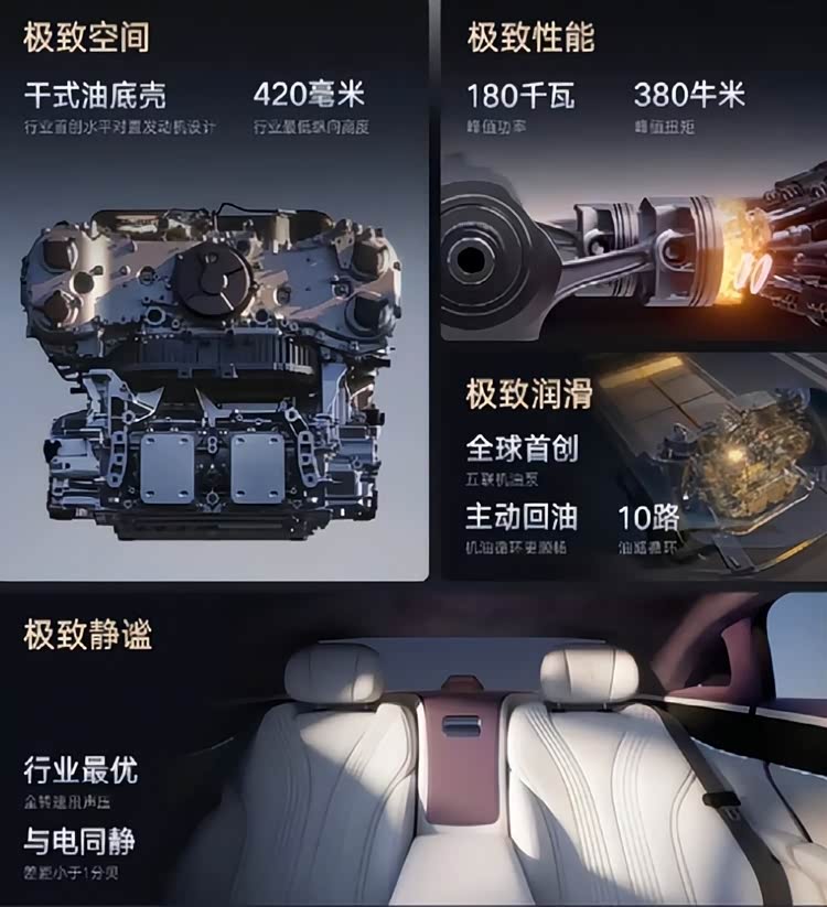 而且,混动车型要搭载发动机和电动机,本身机舱的空间就更紧张。水平对置发动机能占用更小的体积、带来更好的运动表现,再加上降低车头高度、降低重心等等优势,对于仰望U7的需求来说,简直就是量身定制。