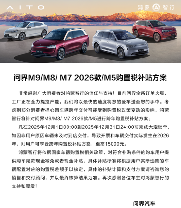 问界跨年购置税补贴将于12月31日截止!2025年12月31日24:00前完成问界M9 、问界M8 、全新问界M7 、问界M5 大定锁单,可享至高15000元跨年购置税补贴。