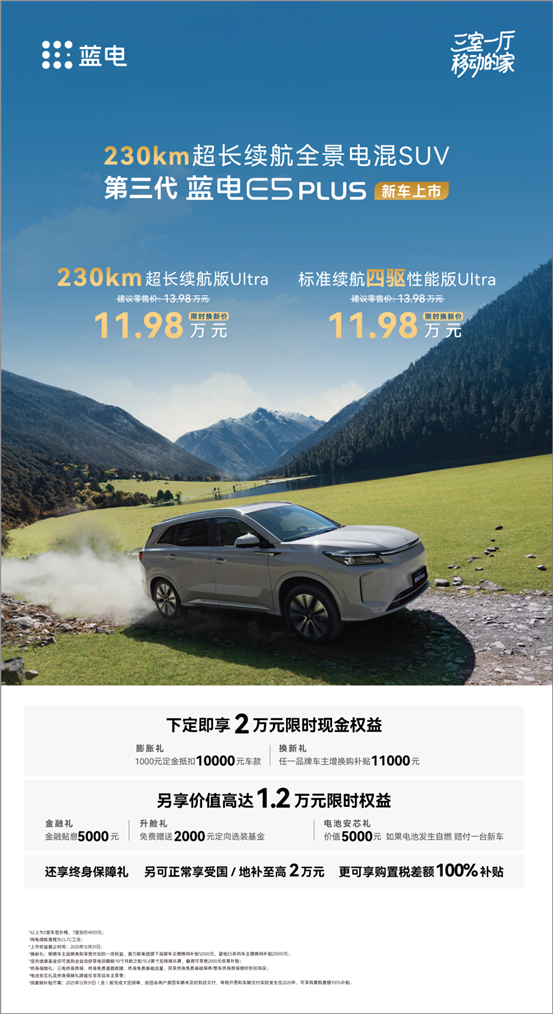 首先是第三代 蓝电E5 PLUS(参数|询价)在2025年12月购车可享多重权益,包括限时换新价、国家及地方补贴、购置税补贴等,具体如下: