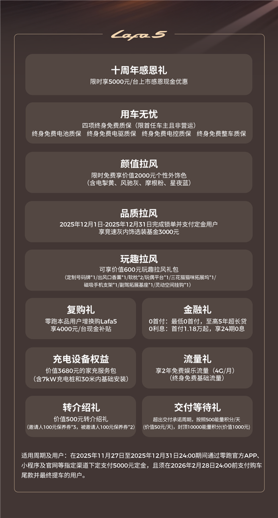值得重点关注的是,新势力品牌零跑汽车也加入了战局,推出了覆盖旗下几乎所有主力车型的12月购车权益。 其优惠活动从11月27日持续至12月31日,涉及Lafa5、B10、C11、C16、T03、C01等超过十款车型。零跑本次优惠的核心特点是现金直降力度大,且金融、置换政策配套齐全,例如旗舰轿车C01的现金优惠高达17000元,小型车T03的优惠也达到9500元。