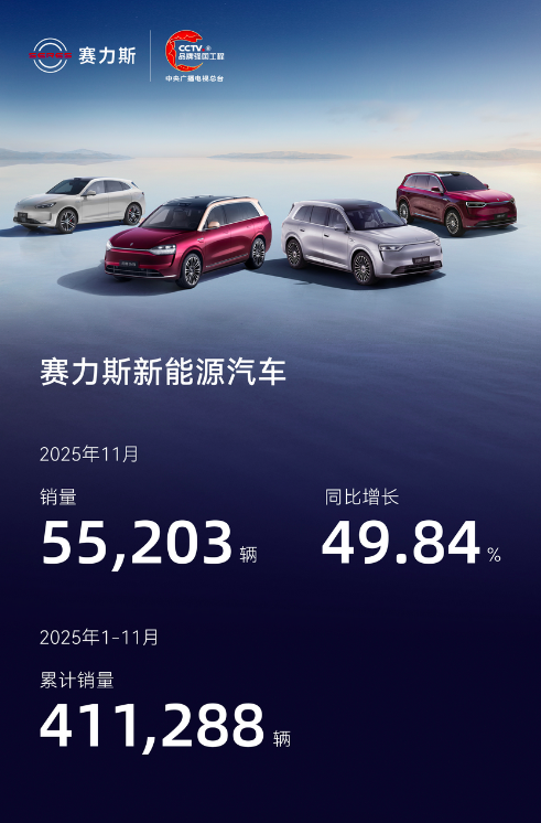 先来看赛力斯这份成绩单的核心数据。2025年11月,公司新能源汽车销量达到55,203辆,同比增长近50%。