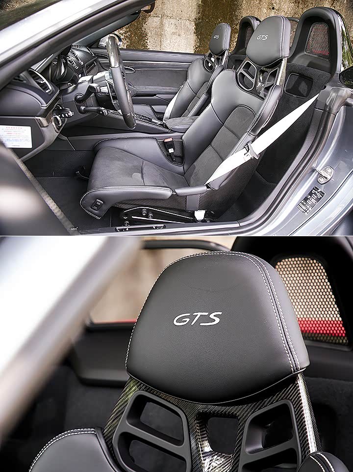 其余部分基本属于 718 Boxster GTS 4.0 的标准配置,仅仅是在车色部分选配金属钒灰 (Vanadium Grey Metallic) ,并搭配可免费选择的红色软篷车顶。笔者认为其在阳光下的质感相当出色,而且灰与红的对比算是相当少见,这样的上空组合确实在低调中、又带着些许抢眼的元素。车侧方面 GTS 4.0 车型在车门前缘下方有着「GTS 4.0」字样贴纸,作为其辨识的一环,足下为标配的 20 吋 718 Sport 轮圈施以消光黑色烤漆。软篷机构方面,其在时速 50 公里以下时,仅需按压按钮便能在 9 秒内完全电动开启或闭合。
