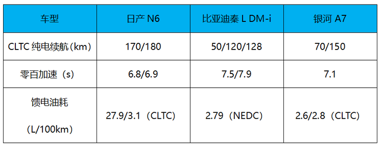 动力配置上,可以看到,日产N6同样表现非常突出,全系车型官方零百加速都是6秒级,而秦L和银河A7则是这个级别比较常见的7秒级加速。在消费者对插电混动车型非常在意的馈电油耗表现上,日产N6按照CLTC标准,馈电油耗百公里2.79升(顶配3.1升),和对手基本处于同一水平,考虑到N6更高的纯电续航以及更强的动力,这个油耗表现已经是非常优秀的水准。