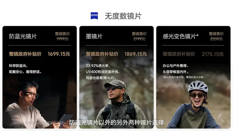 感光变色镜适合不想更换眼镜的用户,可在户外与室内自动转换,这类镜片的优势是兼容性强。价格方面,基础版本从1999元起,根据镜片类型不同对应不同补贴价。对于需要屈光镜片的用户,额外定制成本属于正常范围,结合补贴后整体预算仍保持在可接受区间。对有真实需求的用户而言,镜片选择直接决定了日常佩戴体验,因此建议在使用场景明确后再决定版本。