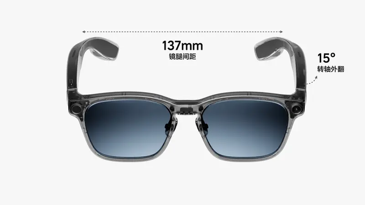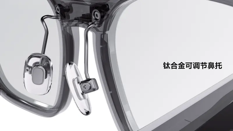 镜架重量36克,采用瑞士EMS医疗级TR90材料,镜腿、鼻托、转轴等细节均围绕佩戴稳定性进行调整。结构参数中最关键的是镜腿间距137mm、转轴15度外翻角度与钛合金鼻托的调节范围,这些属于智能眼镜的基础设计,决定长时间佩戴是否会出现压鼻、夹耳等不适。