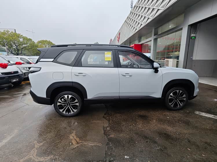 转到车身侧面,悬浮式车顶设计是一大亮点,这种设计不仅让车辆看起来更加轻盈、时尚,还提升了整车的科技感。同时,亮黑色车顶行李架的配备,不仅实用,还进一步强化了车辆的运动风格。再加上前后隆起的轮眉线条,使得车身侧面有着不错的层次感,线条流畅且富有力量感。