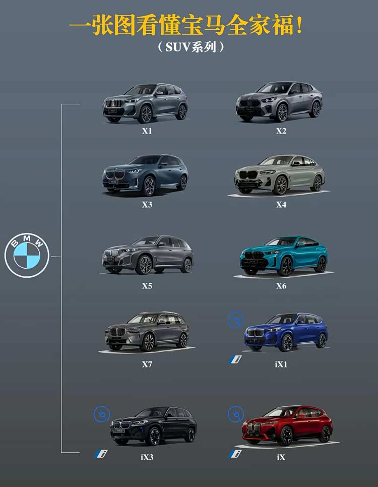 爱个性选X4/X6(轿跑SUV,颜值拉满) 硬核玩家冲X5/X7(空间大 动力猛)。