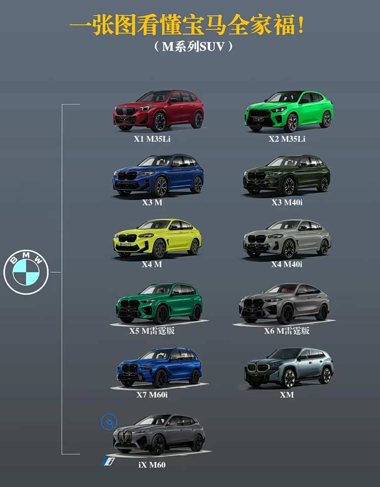 M系SUV更狠!X3M(钢炮SUV)、X5M雷霆版(油门踩穿地心)、XM(限量性能兽,百万级)、iXM60(纯电硬核派,加速比燃油还猛)!