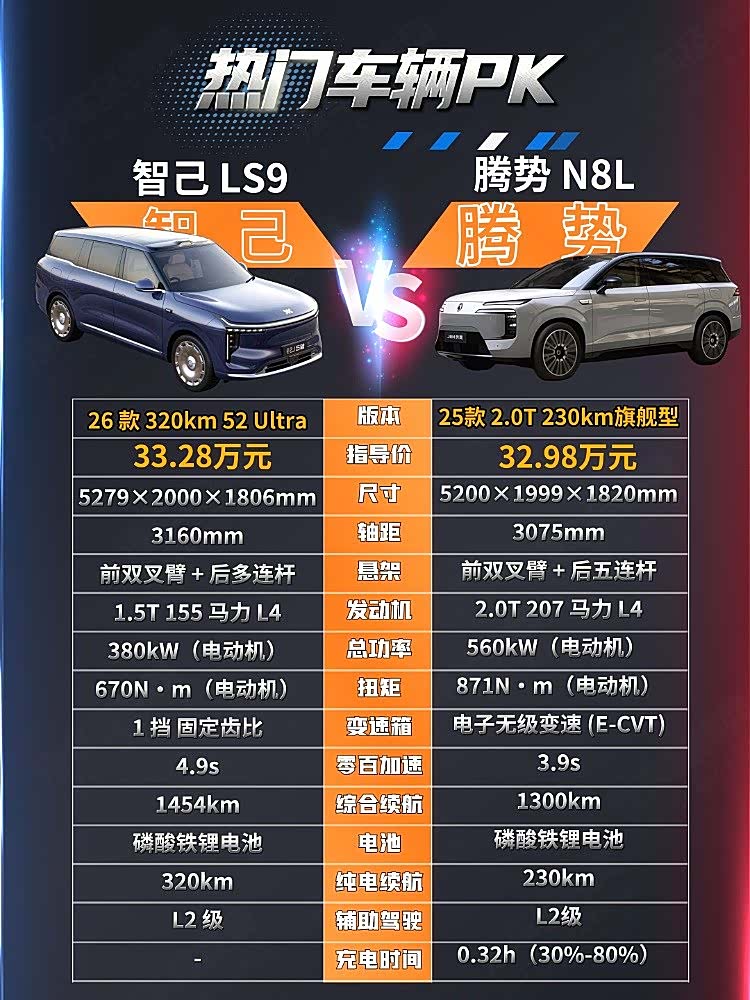 智己LS9 2026款52 Ultra售价为33.28万元,腾势N8L 2025款旗舰型售价为32.98万元,两款车均定位于大型SUV,品牌影响力方面也基本是旗鼓相当,那么哪一款车更值得入手呢?