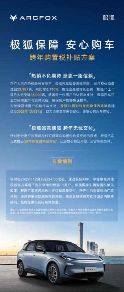 伴随年底将至,不少消费者也担心:现在下单,万一跨年交付,购置税会不会涨?对此,极狐汽车已率先行动——正式推出“跨年购置税补贴方案”: