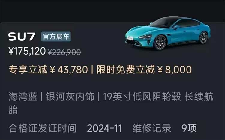 另外,最近小米汽车官宣了一项现车选购政策,在其官方APP上架了一些全新现车、官方展车、准新车的资源,雷军本人表示这些现车经过了严格的质检,可享快速提车、完整原厂质保和售后。尽管这些展车和准新车是官方修复的新车,消费者可以理解为瑕疵车或是运损车,但是经过了小米汽车的官方修复,可以享受和全新车一样的质保政策,但是价格上是有优惠的,比如原价22万多的SU7,虽然库存时间可能长达一年,有官方修复记录,但是价格只有17万多,性价比比较高。